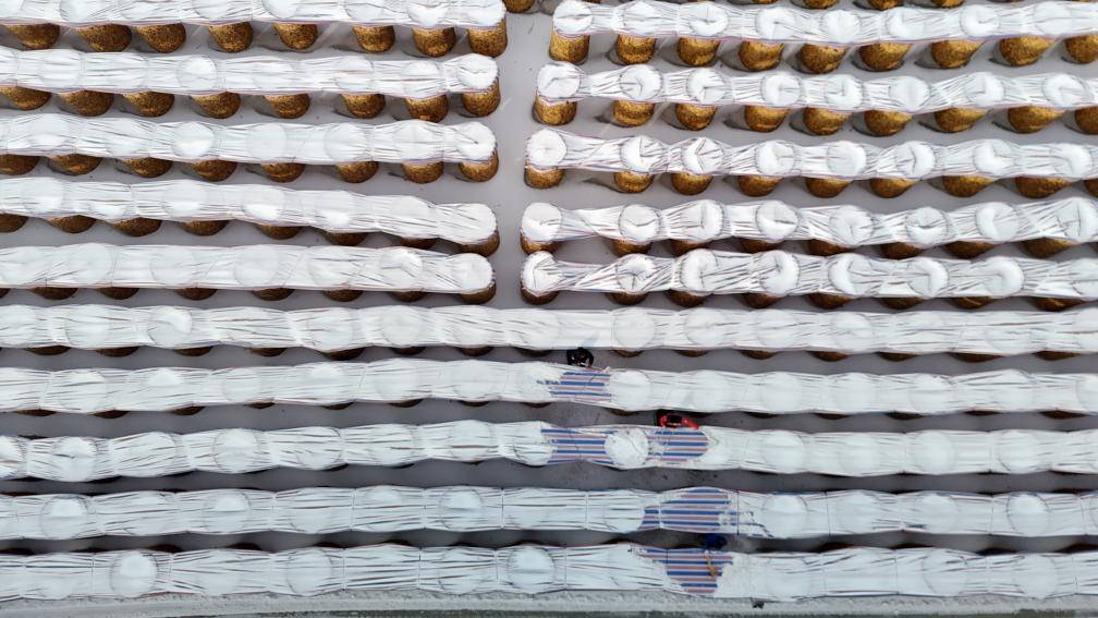 1月19日,山东省滨州市滨城区杨柳雪镇的农民在清理玉米囤苫盖上的积雪(无人机照片)。新华社发(初宝瑞摄)