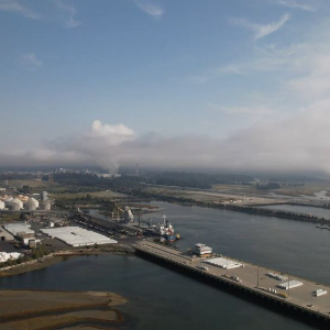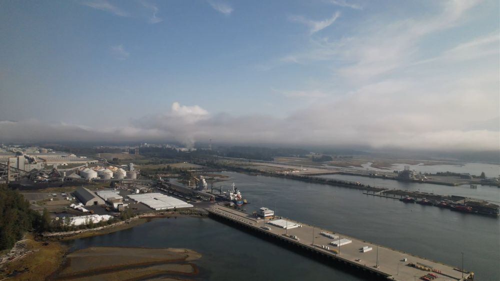 我们放飞无人机,在拍摄镜头中,加拿大液化天然气项目巨大的液化设施和隔着狭小海湾的雪松液化天然气项目静静地笼罩在峡湾的薄雾中,天然气火炬熊熊燃烧,照亮崎岖的海岸线。