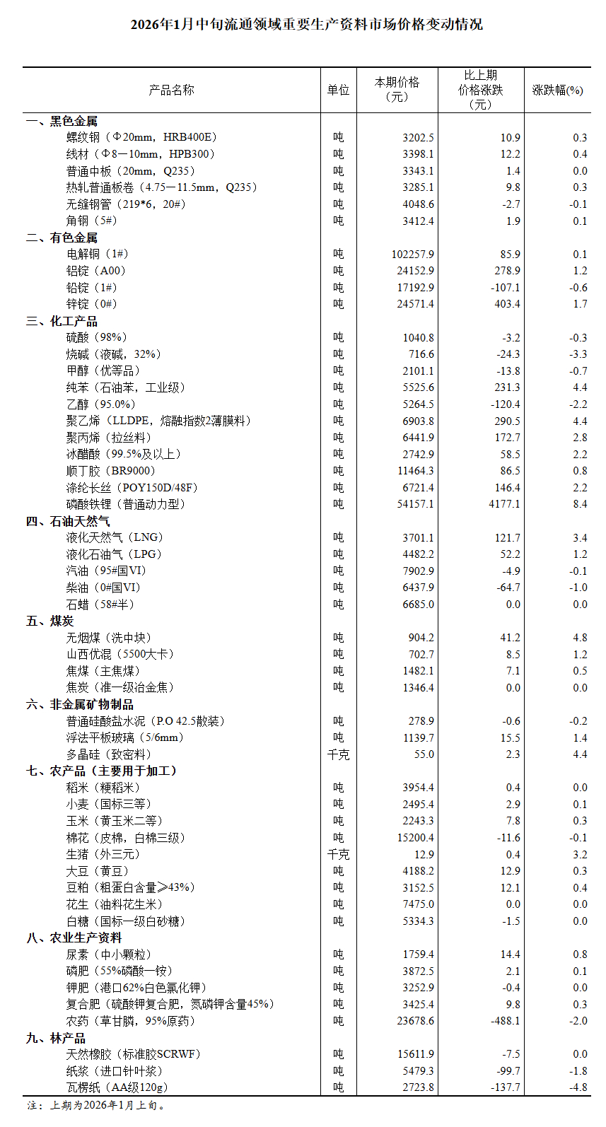据国家统计局网站消息,国家统计局1月24日发布2026年1月中旬流通领域重要生产资料市场价格变动情况。据对全国流通领域9大类50种重要生产资料市场价格的监测显示,2026年1月中旬与1月上旬相比,29种产品价格上涨,13种下降,8种持平。