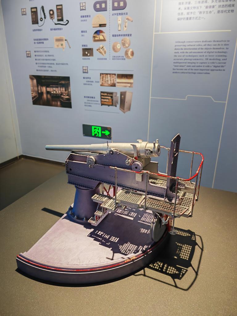 展厅中央的3D打印克虏伯铁炮模型,便生动诠释了这一点。这台模型的诞生,是科技赋能文物修复的鲜活实践。因馆藏克虏伯要塞炮残缺严重,修复团队辗转多地博物馆寻访同类型实物,通过实地手动测量,利用软件进行工业制图,经建模、模拟复原后,利用现代制作工艺复刻出缺失零部件,最终实现科学修复。