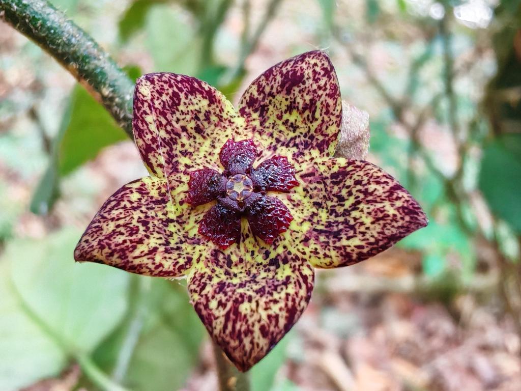 据介绍,铜壁关醉魂藤分布于海拔1600米至1800米的常绿阔叶林中,花期4个月至5个月,果期6个月至8个月。它因花冠表面具深紫色斑点或斑块、副花冠裂片顶端锯齿状,基部具瘤状突起,两侧具乳突、茎和叶密被棕黄色绒毛等特征,而很容易与该属的其它物种区分开来。