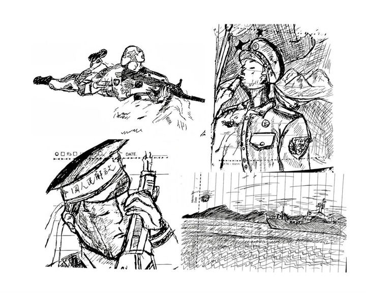 日记的封面印有金色大字“人民海军”。翻开首页,映入眼帘的是这样一句话:“无名无利无悔,有情有义有祖国。”本子里还夹着一幅手绘插画——一名军人正向军舰庄严敬礼。日记中还记录着这样的心声:“一个军礼,一生托付,一句誓言,一生承诺!”字里行间,是一个青年对家国的赤诚与担当。