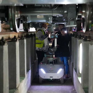 一台三维扫描结构巡检机器人正沿着几十公里长的轨道行进,检测轨道几何尺寸、隧道结构等。