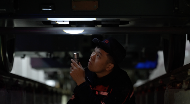 另一条检修地沟里,检测员两人一组,举着手电筒仰头检视车底。他们中年龄最大的31岁。
