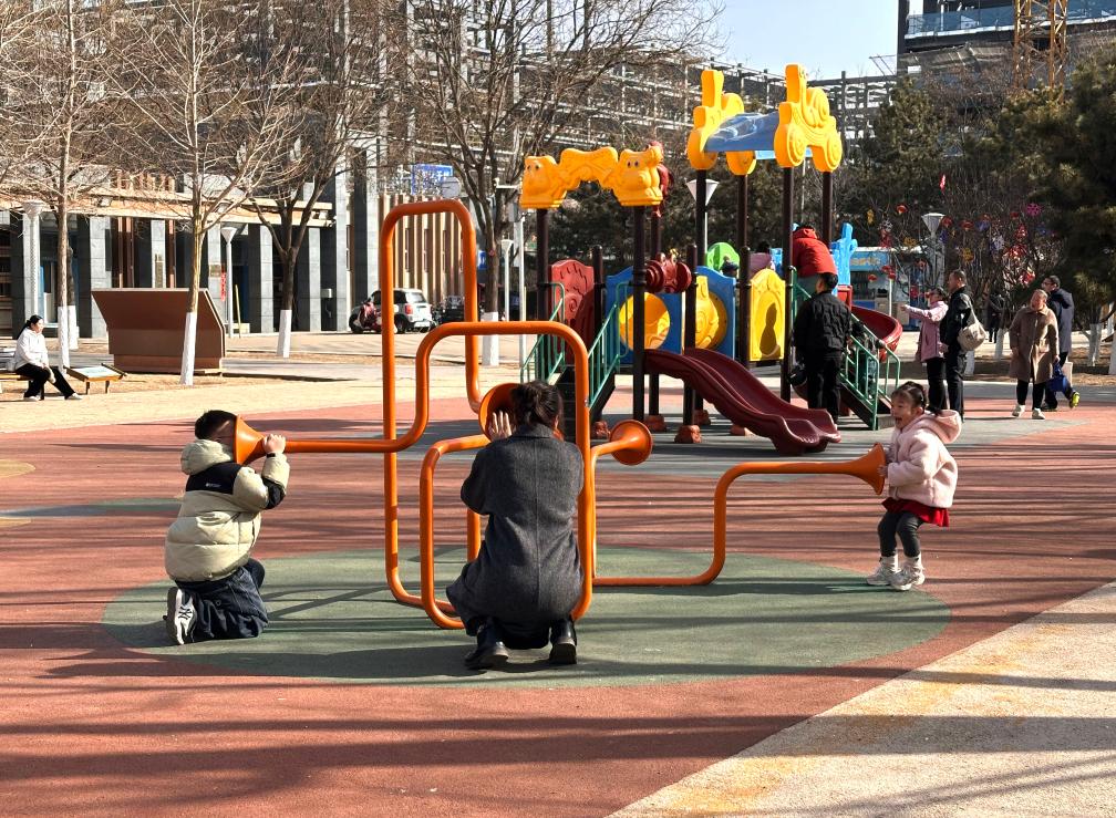 2月20日,孩子们在张家口市民广场公园里的户外游乐场里玩耍。新华社记者 唐霁 摄