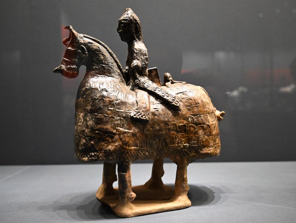 2月11日在郑州大象陶瓷博物馆拍摄的褐釉甲骑具装俑。新华社记者 郝源 摄