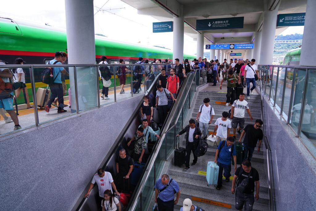 图为在中老铁路磨憨站,乘客正在走下站台。(国铁昆明局供图)