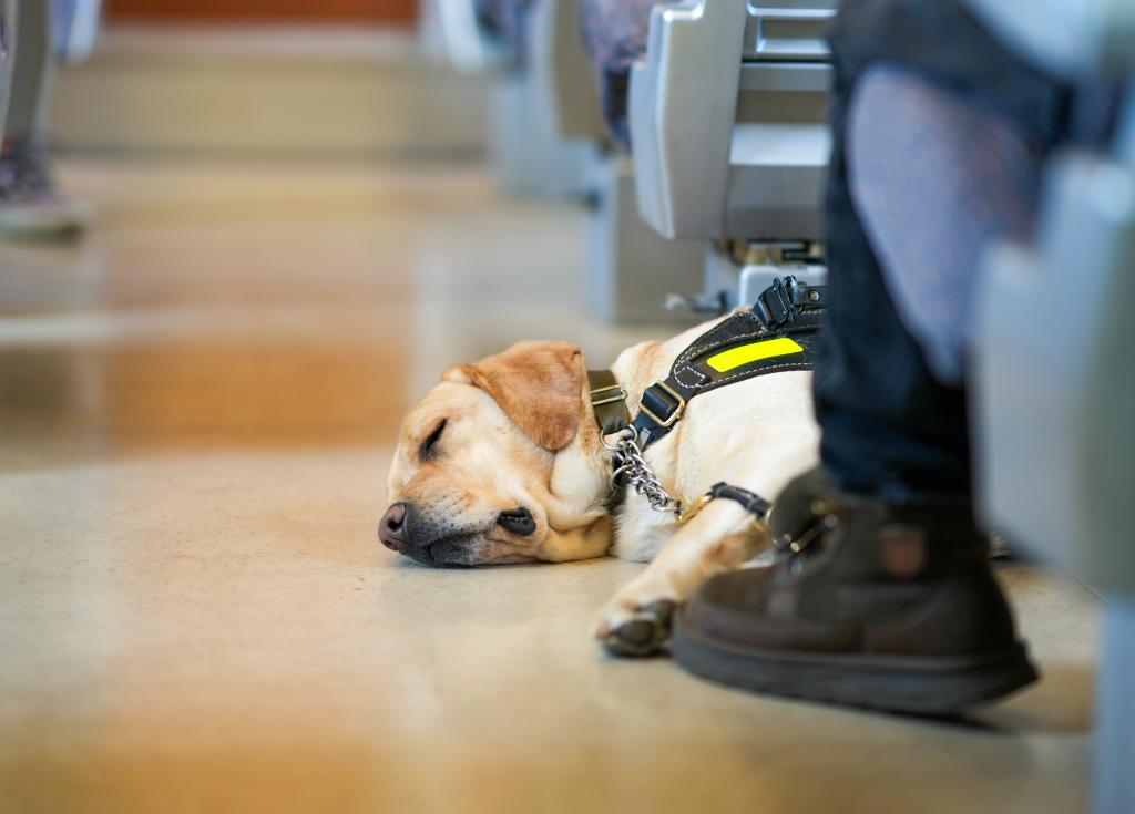 列车开动后,导盲犬“拿铁”躺在主人身边休息。新华社发(韩旭刚 摄)