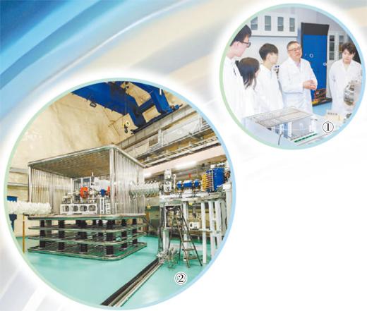 图①:柳卫平院士(右二)和团队。王 璇摄 图②:锦屏深地核天体物理加速器。中国原子能科学研究院供图
