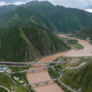 无人机正在扎曲附近测量河道周边地形。新华社发