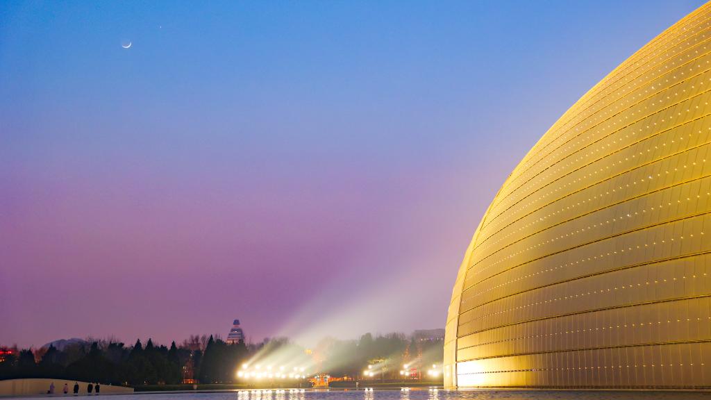 2023年2月22日傍晚在北京市西城区拍摄的金星伴月。(王俊峰 摄)