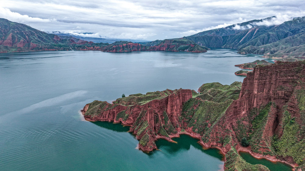 红色丹霞岩壁连绵起伏,陡峭矗立,碧绿黄河水蜿蜒穿行在峡谷间。两岸林木葱郁,山间云雾时聚时散,一步一景,浑然天成。