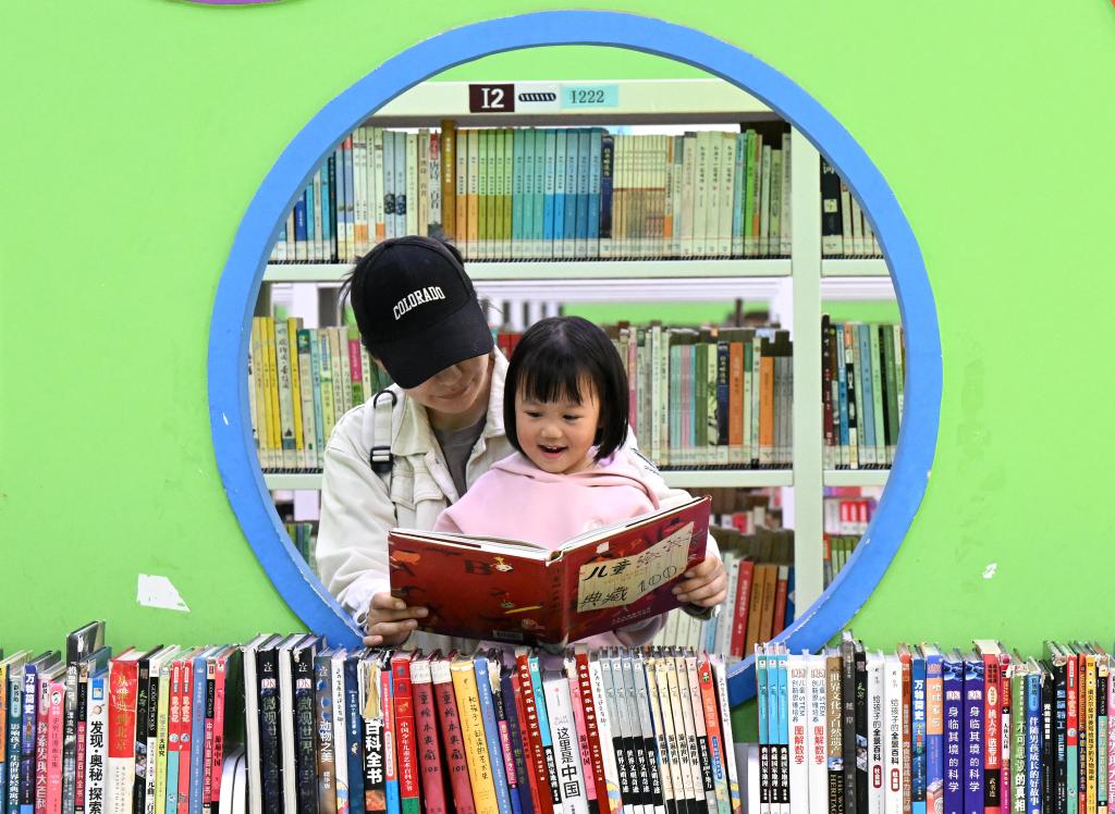 4月23日,小朋友和家长在河北省石家庄市图书馆少儿区阅读。新华社发(陈其保摄)