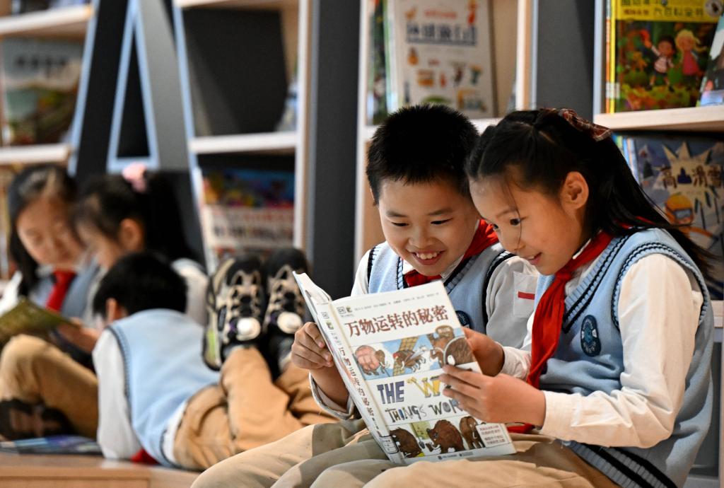 4月22日,小朋友在河北省石家庄市柏林庄学校图书馆阅读。新华社发(陈其保摄)
