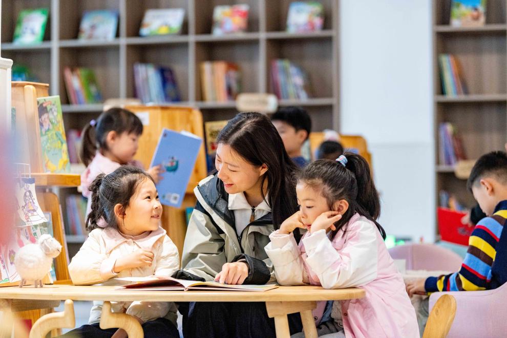 4月22日,老师带小朋友在江苏省泰州市御园路幼儿园阅览室阅读绘本。新华社发(杨玉岗摄)