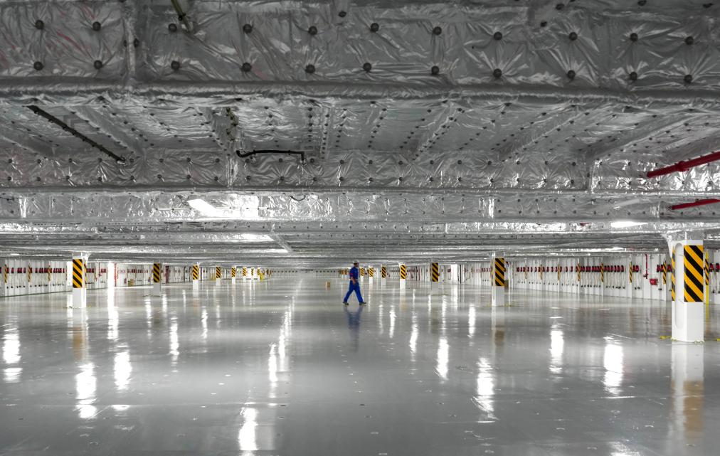 4月28日,一名工作人员走过汽车运输船的第十四层车库。新华社记者 吴鲁 摄