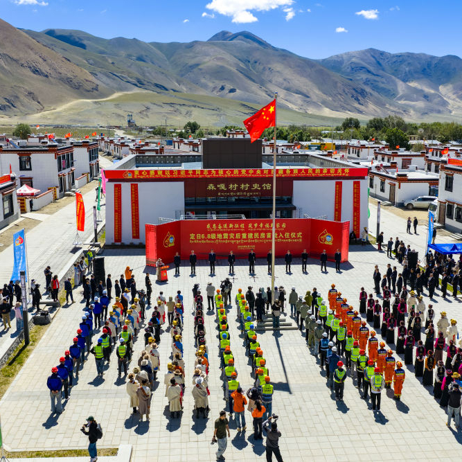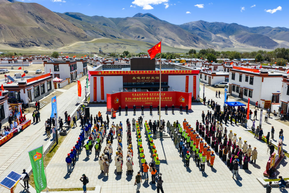 2025年8月15日,定日县长所乡森嘎村举行“定日6.8级地震灾后恢复重建民房首批入住仪式”(无人机照片)。