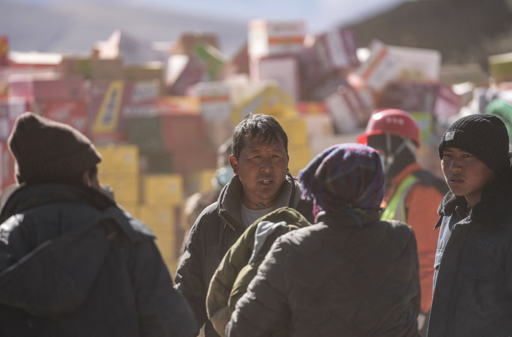 2025年1月10日,定日县长所乡古荣村党支部书记次仁平措(中)协助群众搬进板房。