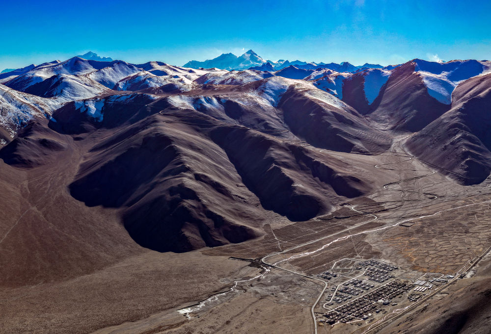 2025年11月12日拍摄的位于珠穆朗玛峰脚下的定日县措果乡野江村(无人机照片)。靠近珠峰方向的房屋为建成并交付群众使用的新房。