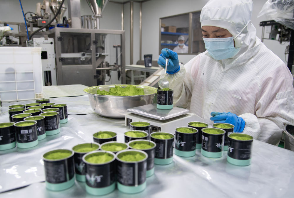 2024年5月22日在湖北省孝感市大悟县金墩村一家抹茶粉企业拍摄的分装工序。大悟县地处大别山南麓,茶产业为该县的支柱产业之一。近年来,当地着力打造全省抹茶生产基地,延长农产品产品链、价值链,推动茶产业升级发展,促进农户增收。