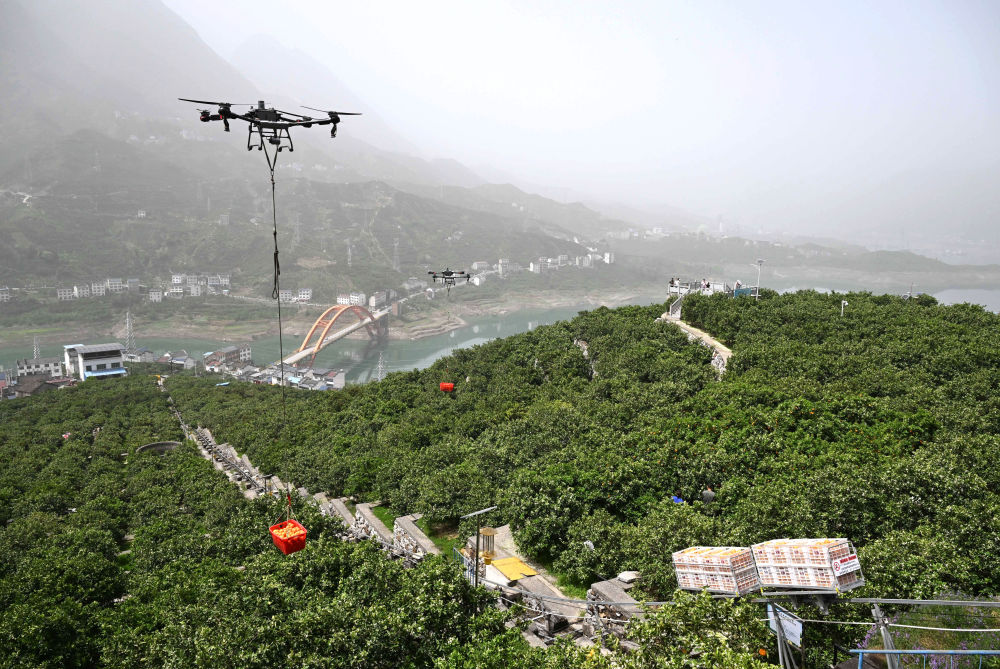 2025年4月13日,湖北省秭归县郭家坝镇烟灯堡村村民用无人机、运输车转运脐橙。在盛产脐橙的秭归县,农用无人机、索道和单轨运输车成为脐橙外运的主力,过去十几个人才能完成的工作,现在只需两个“飞手”。单台无人机每天可搬运3万斤脐橙,大大提升了作业效率和鲜果品质。