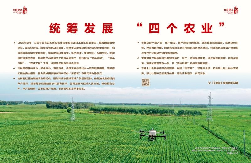 ◇2025年2月,习近平总书记在听取吉林省委和省政府工作汇报时指出,保障国家粮食安全,是农业大省、粮食大省的政治责任。吉林要以发展现代化大农业为主攻方向,完善强农惠农富农支持制度,统筹发展科技农业、绿色农业、质量农业、品牌农业。要积极发展生态养殖,加强农产品精深加工和食品细加工,做足做活“粮头食尾”、“畜头肉尾”、“农头工尾”文章,构建多元化食物供给体系。