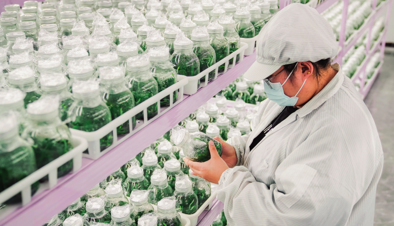 在位于吉林省公主岭市范家屯镇的恒通生态农业科技开发有限公司,工作人员在培育室内观察花卉幼苗生长情况(2025年3月19日摄)。许畅摄/本刊