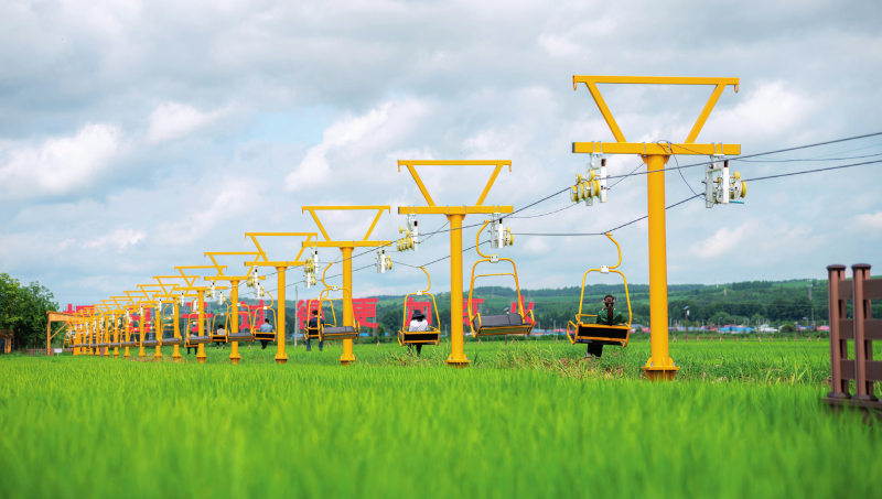 在吉林省和龙市光东村,游客乘坐稻田低空缆车游览(2025年7月18日摄)。邵泽东摄