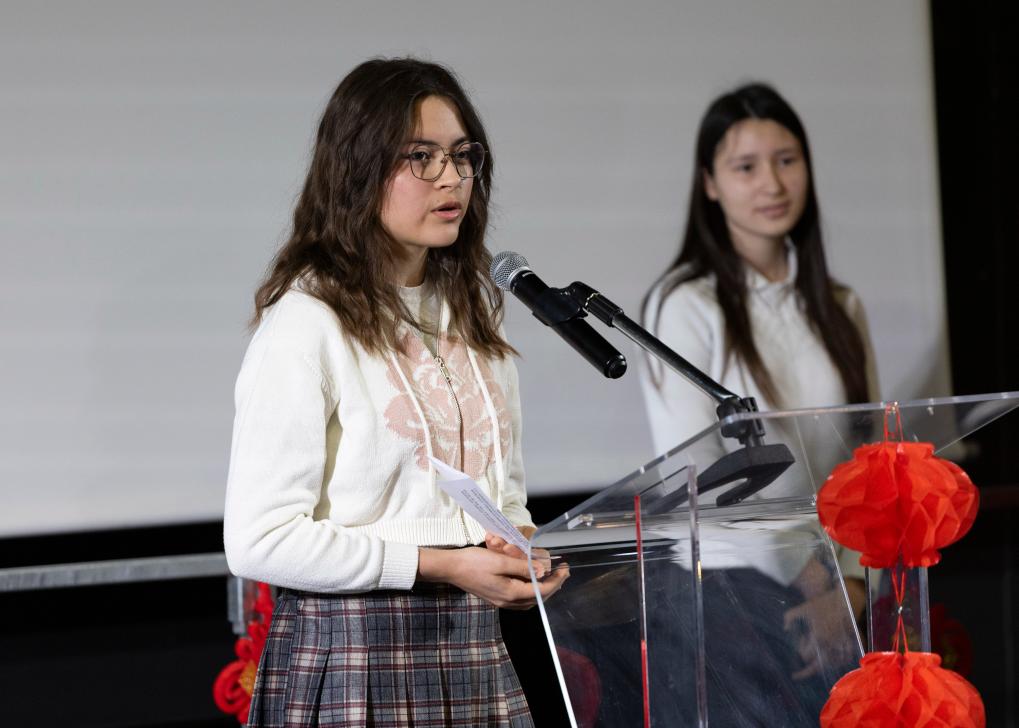 3月12日,在法国普罗旺斯-阿尔卑斯-蓝色海岸大区国际学校,中国驻马赛总领馆向学校转交习近平主席复信。这是该校中文班学生伊西丝在活动现场发言。新华社记者 邬惠我 摄