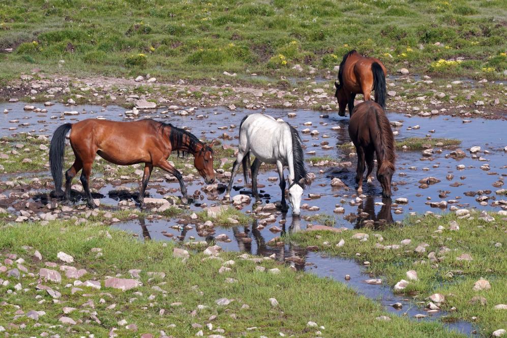 2024年7月10日,马群在山丹马场草原上的溪流旁饮水。新华社记者 马宁 摄