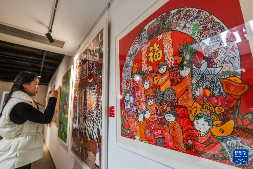 1月23日,游客在湖州吴兴的小西街西岸美术馆观赏年画美术作品。