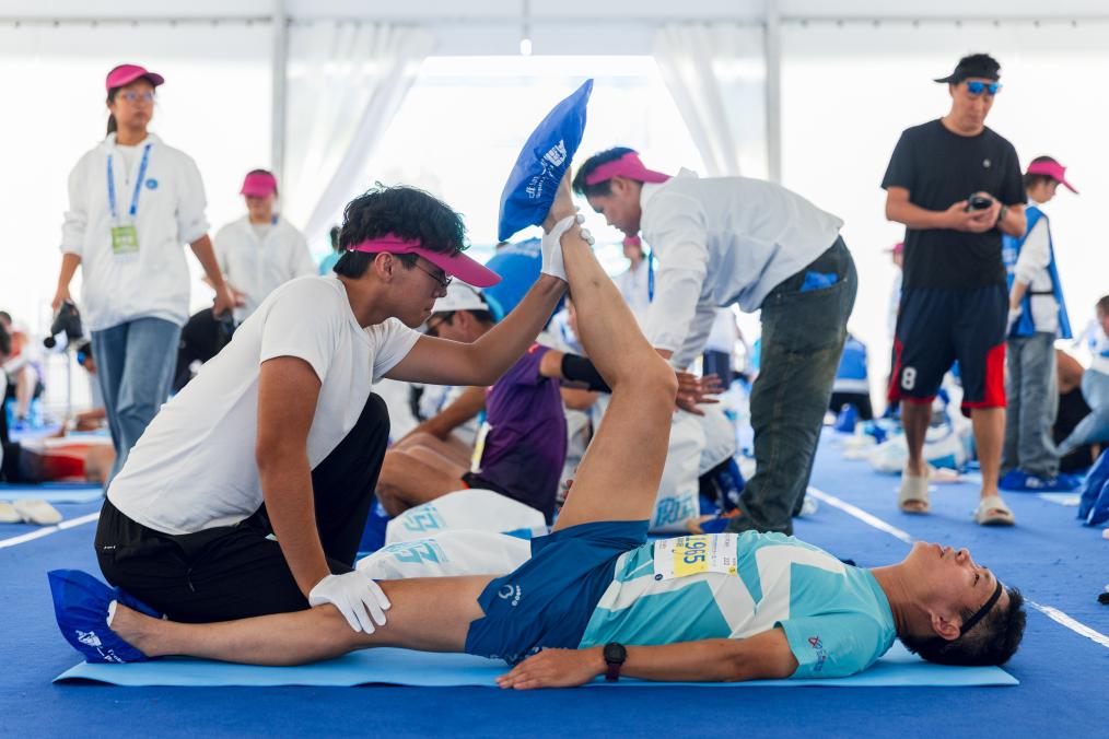 9月21日,衡马服务人员向完赛选手提供拉伸服务