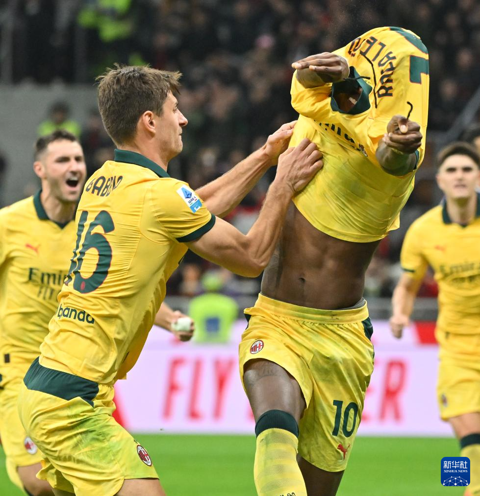 10月19日,AC米兰队球员莱奥(右)在比赛中庆祝进球。