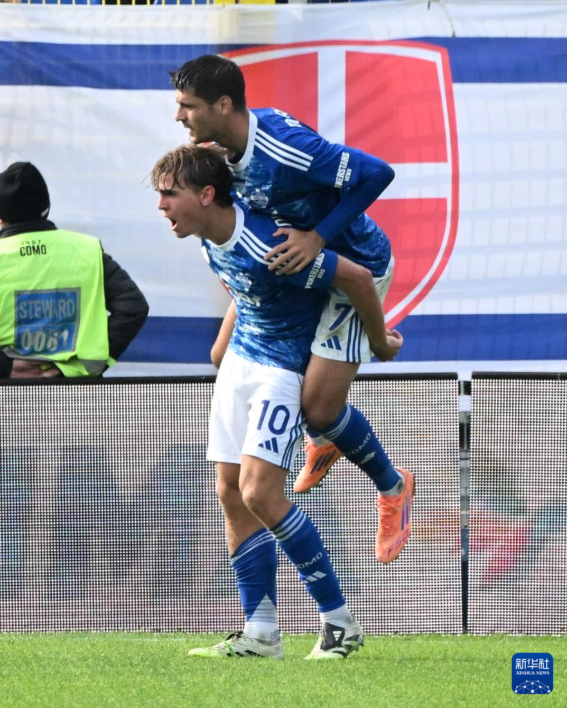 10月19日,科莫队球员尼科·帕斯(左)与队友莫拉塔在比赛庆祝进球。
