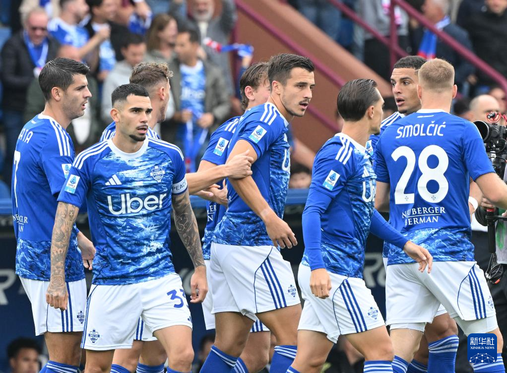 10月19日,科莫队球员肯普夫(在)在比赛中庆祝进球。