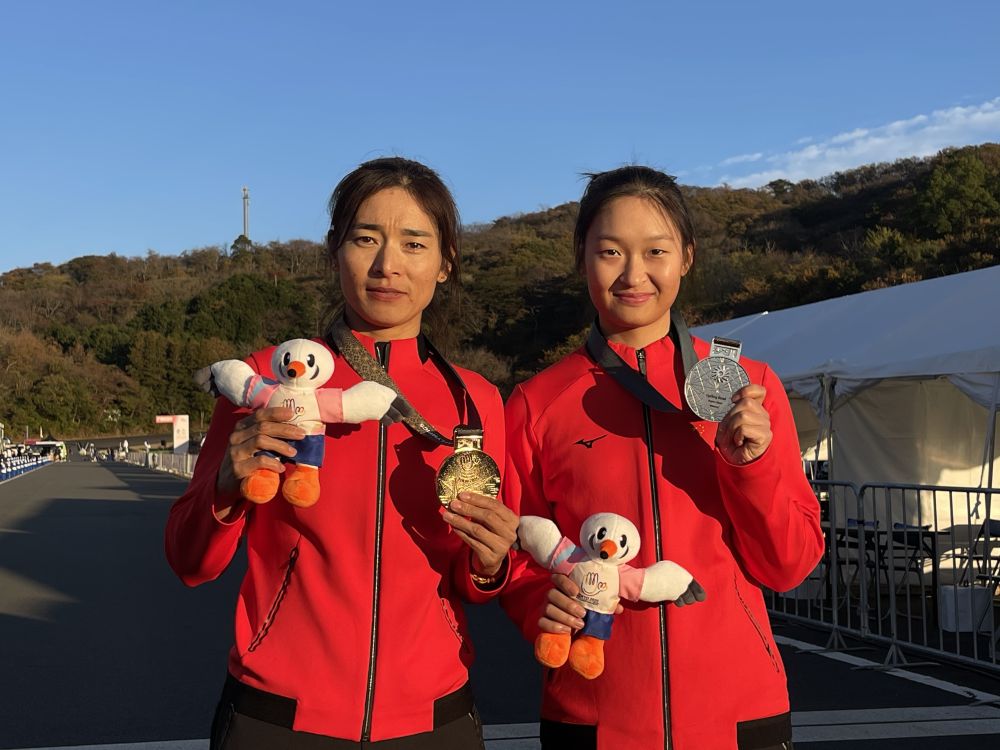 女子公路自行车20公里积分赛冠军孟艳(左)和亚军王琦琦。中国残联供图