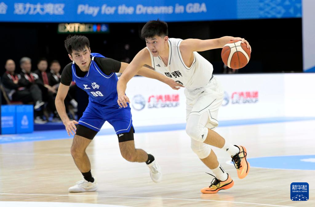 11月19日,上海队球员万孟霖(右)在比赛中突破广东队球员王浩然的防守。