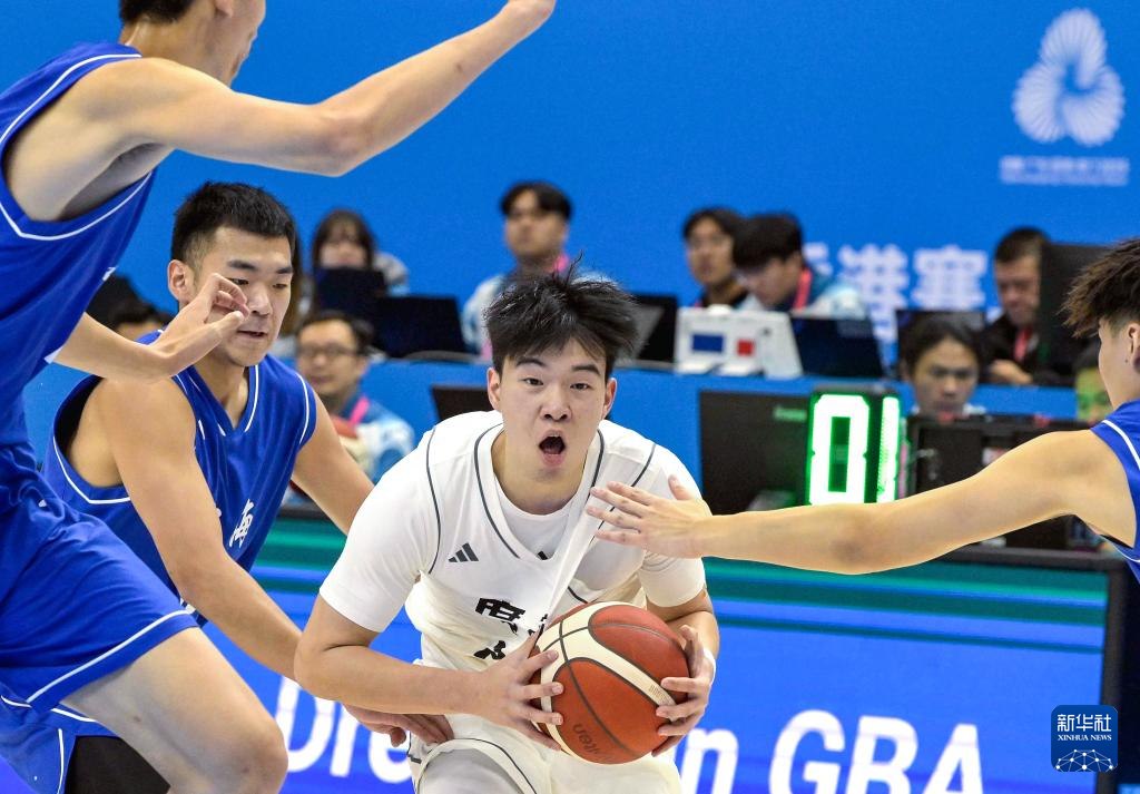 11月19日,上海队球员郭丰玮(中)在比赛中与广东队球员武子涵(右)、徐昕拼抢。