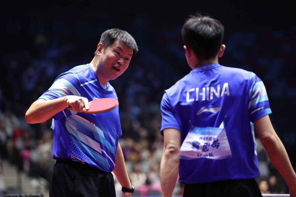 11月18日,辽宁队组合袁励岑/侯英超(左)在比赛中交流,他们在双打比赛中0:3不敌北京队组合马龙/王楚钦。新华社记者 梁旭 摄