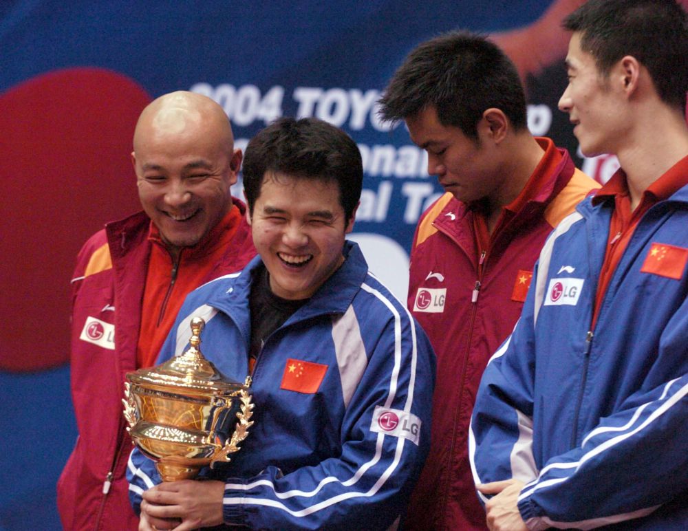 2004年12月19日,在广州进行的2004丰田杯国际乒乓球邀请赛男团决赛中,中国队获得冠军,中国男团队员王励勤、侯英超、刘国正和教练(从右到左)登上冠军领奖台。 新华社记者 刘大伟 摄