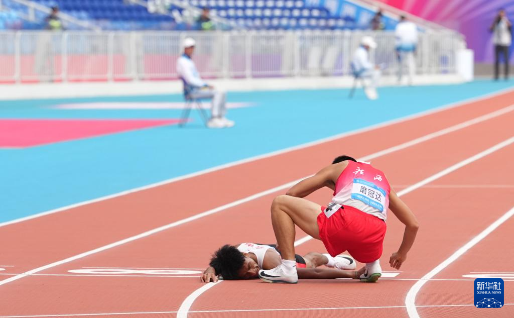 12月10日,广西队选手磨冠达在男子200米T36级决赛后询问摔倒的云南队选手陶小罗。