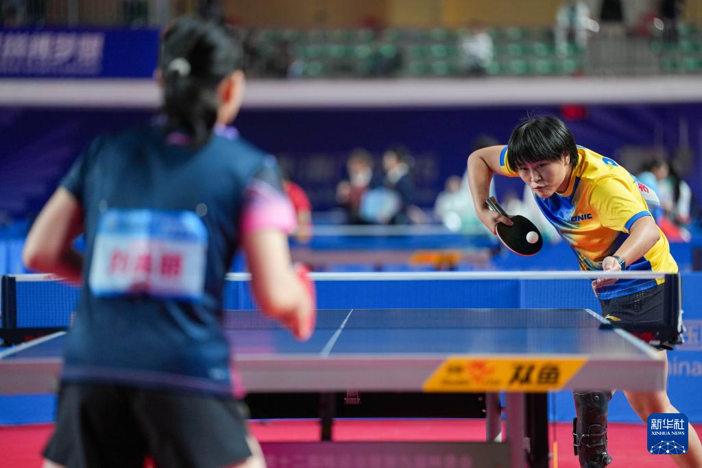 12月10日,湖北队选手柳萌(右)在乒乓球TT9女子单打小组赛中。最终,她3比0战胜安徽队选手刘美丽。