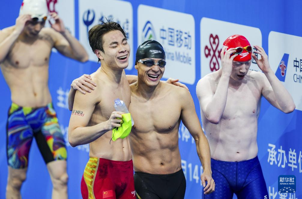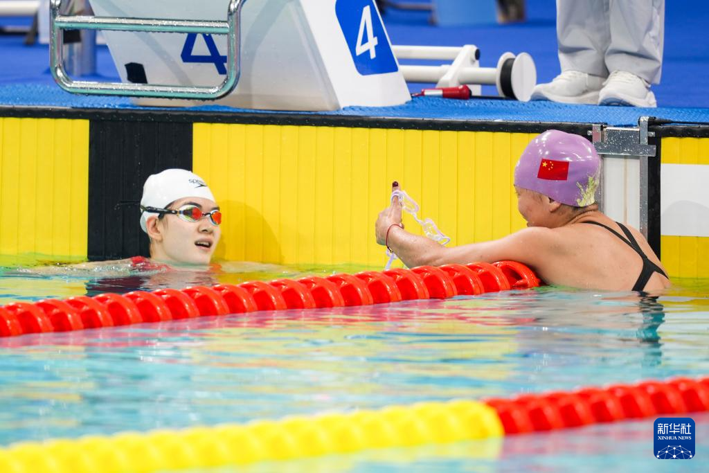 12月10日,湖北队选手福清(上)在男子100米仰泳S15级预赛后与队友邓鹏秸使用手语交流。
