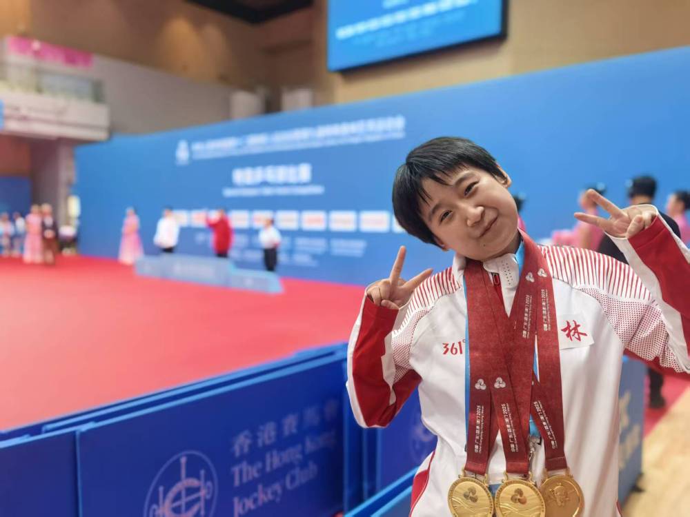 此后,王莹踏上了“收割奖牌”的道路。2016年,她在南京举行的全国特奥乒乓球比赛中摘得女单金牌;2019年,她带病参加天津全国第七届特奥会,斩获2金1铜;2021年陕西全国第八届特奥会,她将混双、女双、女单金牌全部收入囊中,同时拿下团体铜牌。本届残特奥会,她在香港再度收获三金。