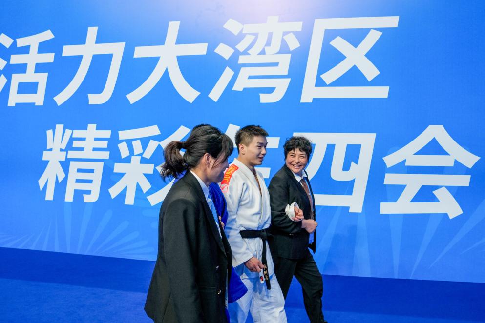 12月9日,李跃华(右一)赛后引导队员朱世文(中)退场。朱世文获得全国残特奥会盲人柔道男子J1-70公斤级金牌。