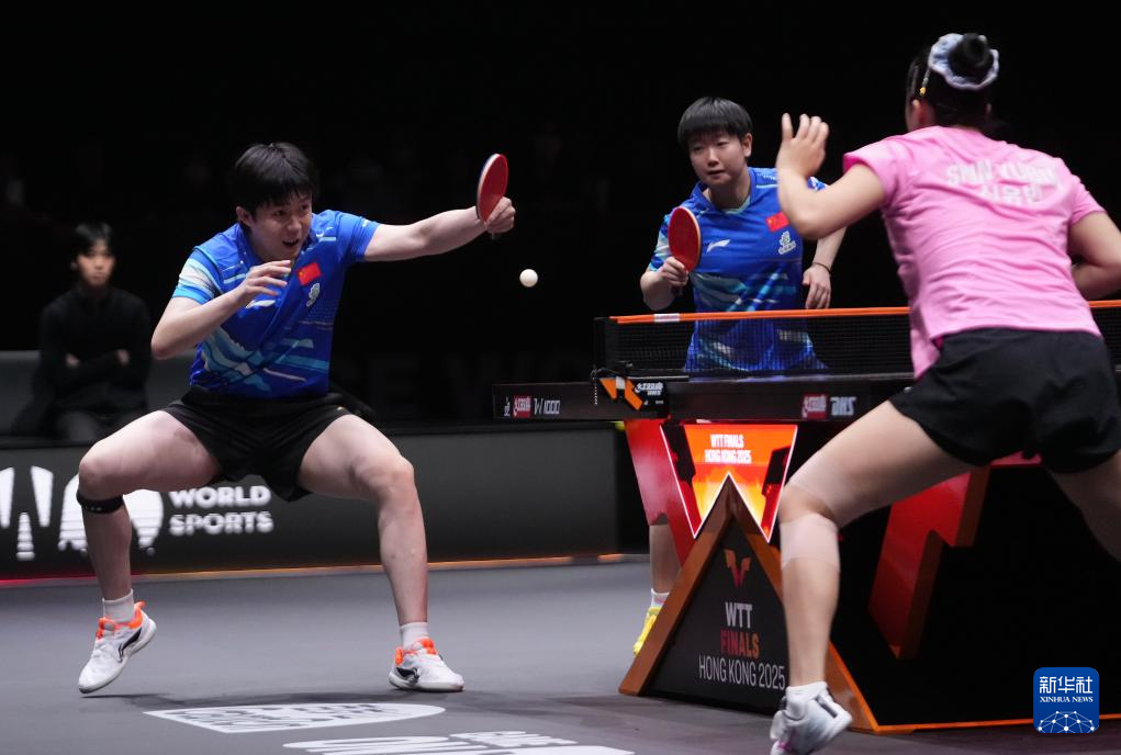 12月13日,王楚钦/孙颖莎(右)在比赛中。