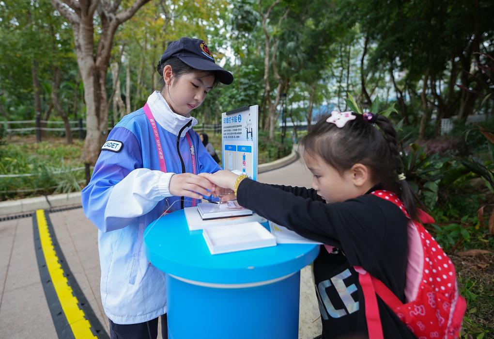 12月14日,香港高中生义工叶钰莹(左)为小朋友盖纪念章。全国第十二届残疾人运动会暨第九届特殊奥林匹克运动会香港赛区,义工服务的身影处处可见。新华社记者 侯昭康 摄