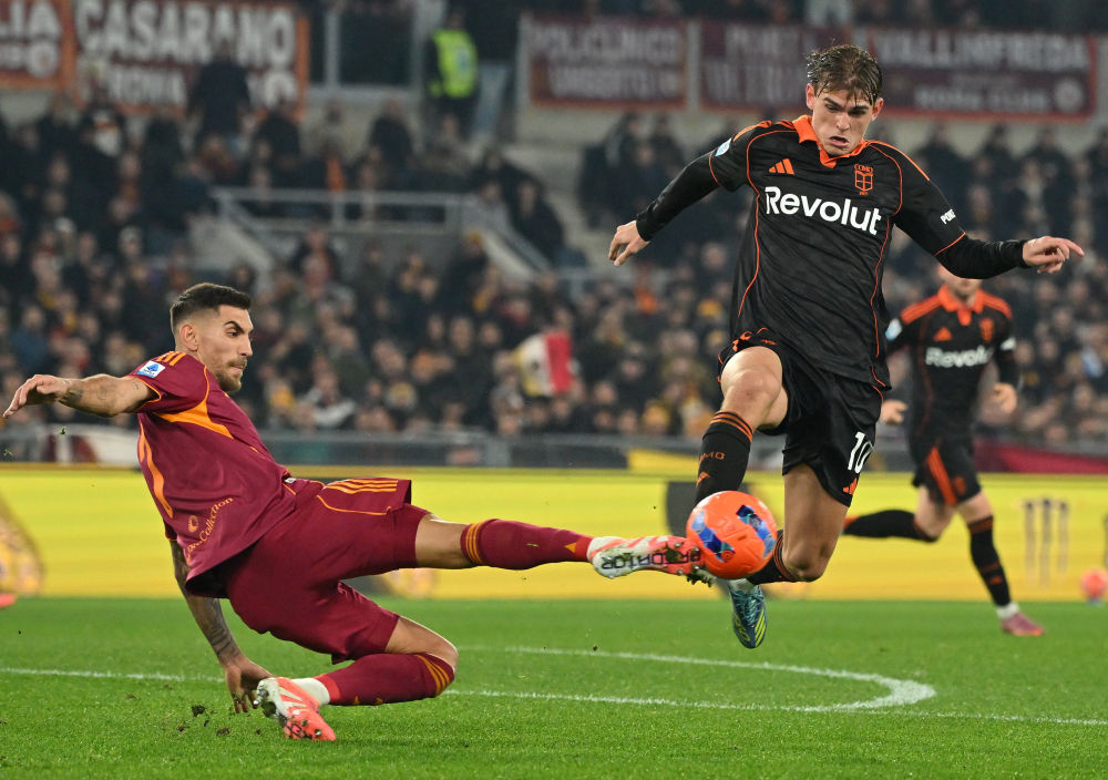 12月15日,罗马队球员佩莱格里尼(左)与科莫队球员帕斯在比赛中拼抢。新华社发(阿尔贝托·林格利亚摄)