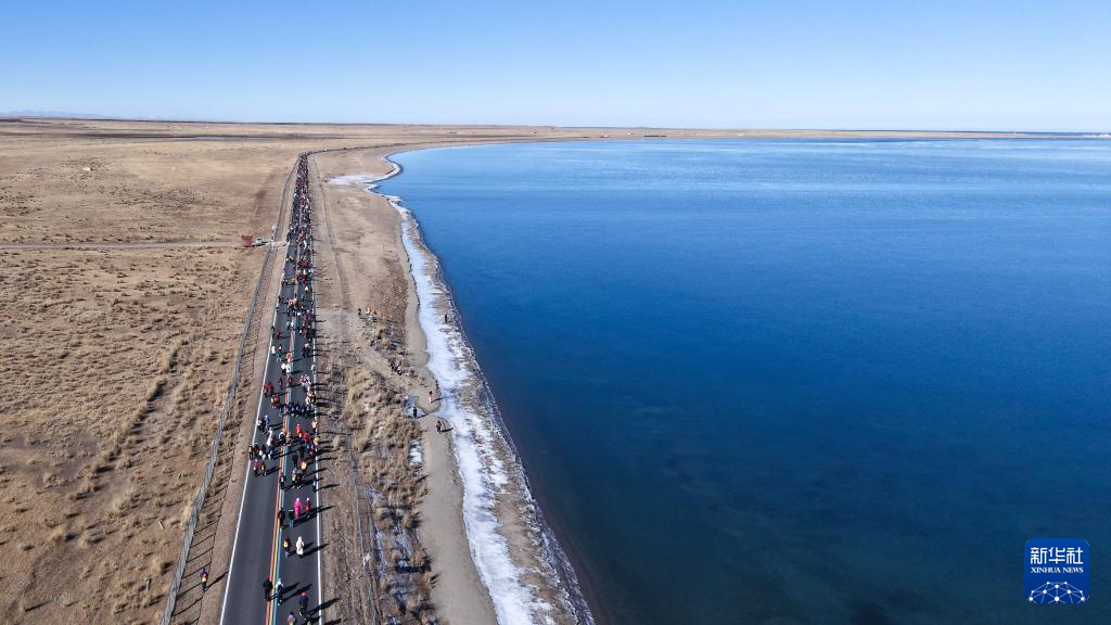 当日,青海湖迎新年生态环保徒步活动在青海省海南藏族自治州青海湖二郎剑景区举行。