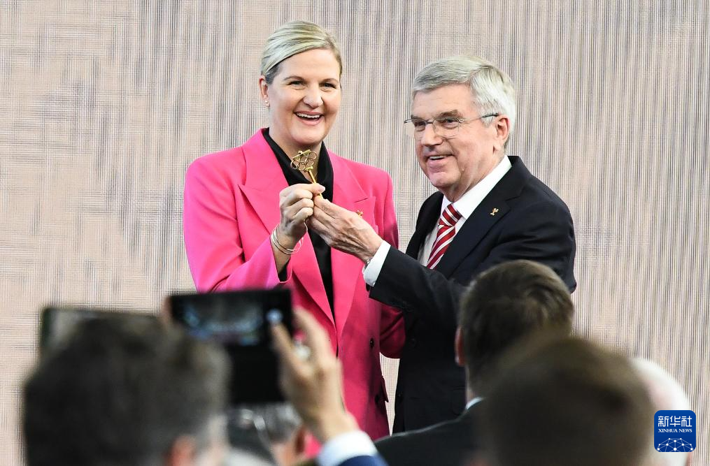 这是2025年6月23日,在瑞士洛桑国际奥委会总部,托马斯·巴赫和柯丝蒂·考文垂(左)在主席职位交接仪式上。新华社记者 连漪 摄